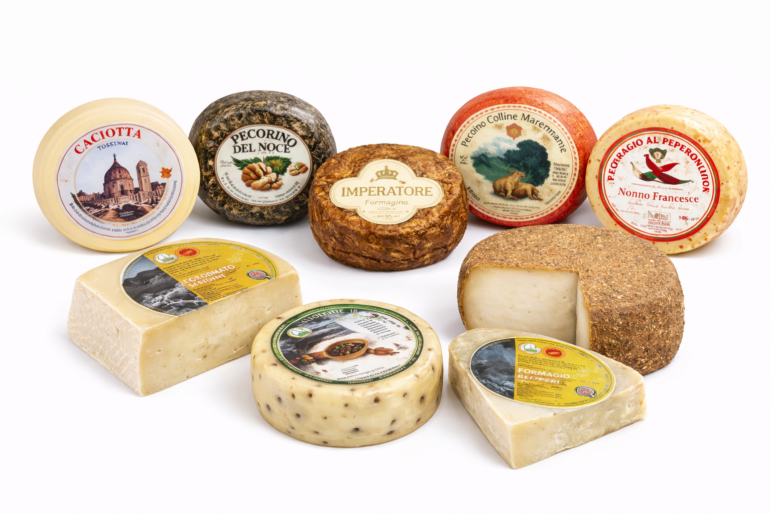 Inizia con la Caciotta Toscana — fresca, delicata, ideale per aprire la degustazione. Passa al Marzolino Paglia e Fieno e al Formaggio al Pepe per note più complesse. Arriva al Pecorino Toscano DOP e al Pecorino DOP Stagionato per la struttura e la sapidità. Chiudi con il Pecorino del Noce e il Marzolino Imperatore Stagionato — i più complessi e persistenti della selezione.